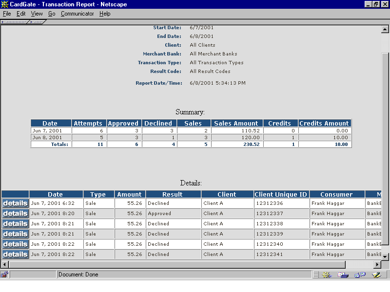 and processes those transactions through the client's